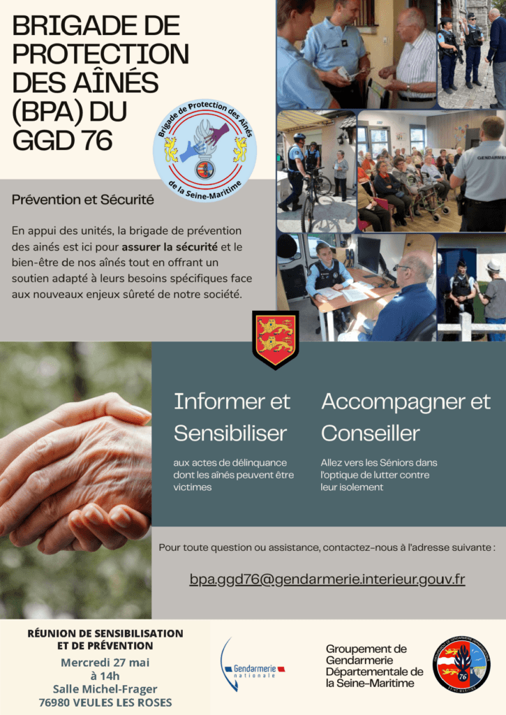 La Brigade de Protection des Ainés du Groupement de Gendarmerie Départementale de la Seine-Maritime organise une réunion de sensibilisation et de prévention :
